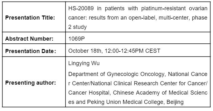 SHANGHAI, October 20, 2025 — Hansoh Pharmaceutical Group Co., Ltd. (Hansoh Pharma, 03692.HK) today announced positive phase 2 study findings of HS-20089, a B7-H4-targeted Antibody-drug Conjugate, in patients with platinum-resistant ovarian cancer (PROC). The findings are being presented in a poster session at the European Society for Medical Oncology 2025 Annual Meeting (October 17-21, Berlin, Germany).