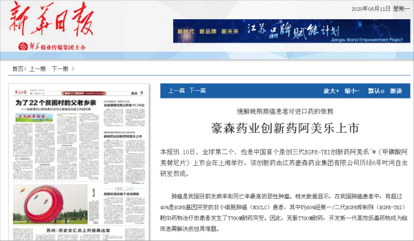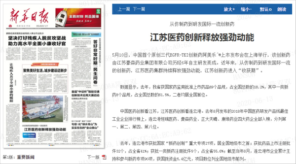 Recently, Xinhua Daily, on the occasion of the launch meeting of Ameile, Hansoh Pharma's Class 1 innovative drug, produced a series of reports under the headline of "Decoding Pharmaceutical Innovation in Jiangsu", describing the responsibilities and actions of enterprises represented by Hansoh Pharma in the accelerated move of Jiangsu's pharmaceutical industry towards "World-Class".