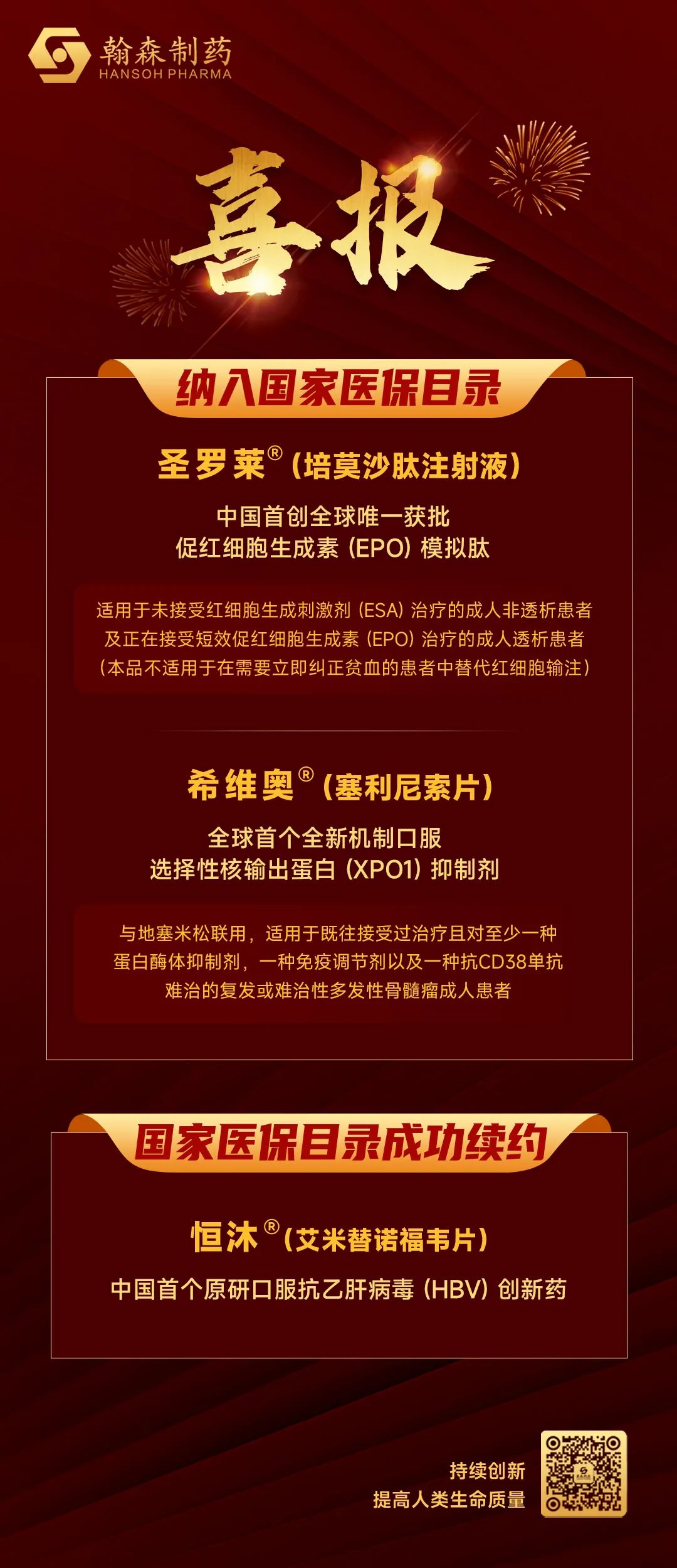 12月13日,国家医保局与人力资源社会保障部公布《国家基本医疗保险、工伤保险和生育保险药品目录(2023年)》(以下简称“国家医保目录”),翰森制药自主研发的1类创新药圣罗莱®(培莫沙肽注射液)两项适应症成功纳入医保,另一款创新药恒沐®(艾米替诺福韦片)也成功续约。新版国家医保目录将于2024年1月1日起正式实施。至此,翰森制药已上市的7款创新药全部纳入国家医保目录。