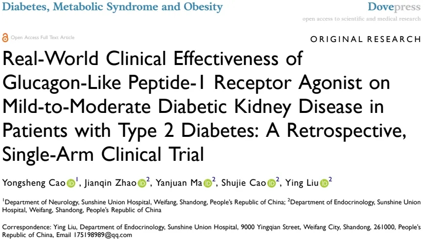 [1] Ying Liu et al. Real-world clinical effectiveness of glucagon-like peptide-1 receptor agonist on mild-to-moderate diabetic kidney disease in patients with type 2 diabetes: a retrospective, single-arm clinical trial.Diabetes, Metabolic Syndrome and Obesity 2024:17 2913–2921.