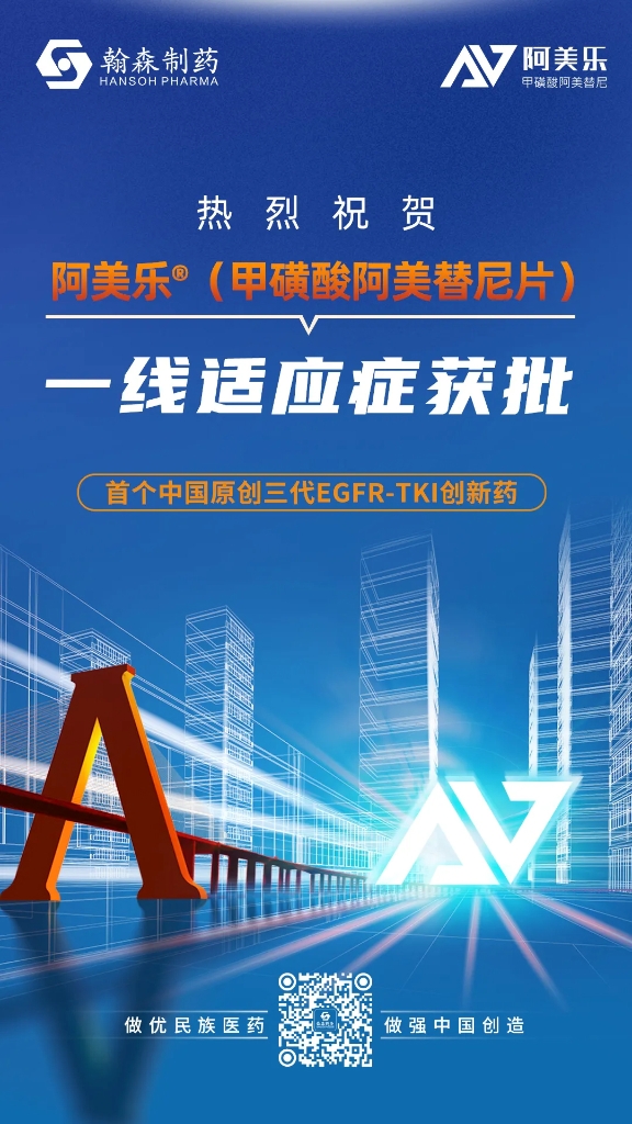 阿美乐®是翰森制药自主研发的1类创新药,也是首个中国原创三代 EGFR-TKI。其在既往经EGFR-TKI治疗时或治疗后出现疾病进展的,存在EGFR T790M突变阳性的局部晚期或转移性NSCLC成人患者治疗方面成效显著,以优先审评品种认定资格得到NMPA快速审批,并获国家“重大新药创制”科技重大专项立项支持。2020年3月,阿美乐®首个适应症获批上市,填补了我国三代 EGFR-TKI 的空白;仅9个月后,阿美乐®成功被纳入国家医保目录;2021年6月,阿美乐®凭借其卓越的疗效和安全性被国家药品监督管理局发布的《2020年度药品审评报告》列为“临床价值高的新药好药”代表之一,为患者提供了更多临床选择,为肺癌患者带来更多希望。此次,阿美乐®用于具有表皮生长因子受体(EGFR)外显子19缺失或外显子21(L858R)置换突变阳性的局部晚期或转移性非小细胞肺癌(NSCLC)成人患者一线治疗适应症获批,正式开启了中国原创三代EGFR-TKI一线治疗全新时代,将造福更多肺癌患者。